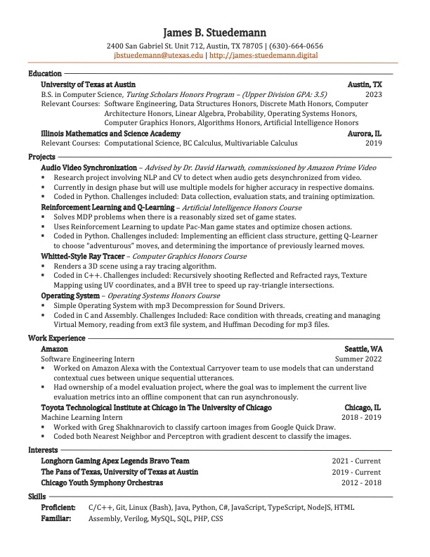 I am originally from the Chicagoland area, where I attended Illinois Math and Science Academy. I got my Bachlor's of Science in Computer Science from the University of Texas at Austin, where I was part of the Turing Schors Honors Program. While there I conducted machine learning based research in computer vision and audio processing under the supervision of Dr. David Harwath.